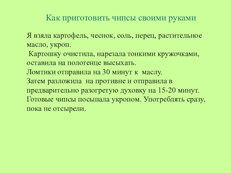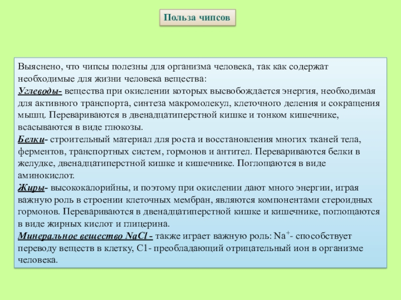 Слайд 11Выяснено, что чипсы полезны для организма человека, так как содержат необходимые
