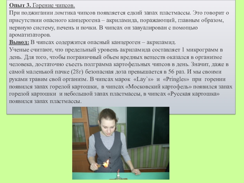 Ученые считают, что предельный уровень акриламида составляет 1 микрограмм в день. Для того, чтобы пограничный объем вредных веществ оказался в организме человека, достаточно съесть полграмма картофельных чипсов в день. Значит, даже в самой маленькой пачке (28г) безопасная доза превышается в 56 раз. И мы своими руками травим свой организм. В чипсах марок «Lay`s» и «Pringles» при горении появился запах горелой картошки, в чипсах «Московский картофель» появился запах горелой картошки и небольшой запах пластмассы, в чипсах «Русская картошка» появился запах пластмассы.