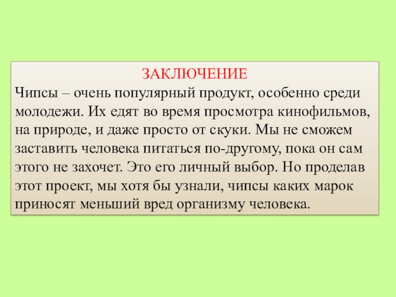 время просмотра кинофильмов, на природе, и даже просто от скуки. Мы не сможем заставить человека питаться по-другому, пока он сам этого не захочет. Это его личный выбор. Но проделав этот проект, мы хотя бы узнали, чипсы каких марок приносят меньший вред организму человека.