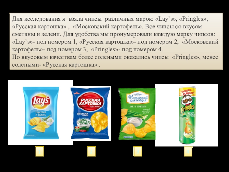 , «Московский картофель». Все чипсы со вкусом сметаны и зелени. Для удобства мы пронумеровали каждую марку чипсов: «Lay`s»- под номером 1, «Русская картошка»- под номером 2, «Московский картофель»- под номером 3, «Pringles»- под номером 4.