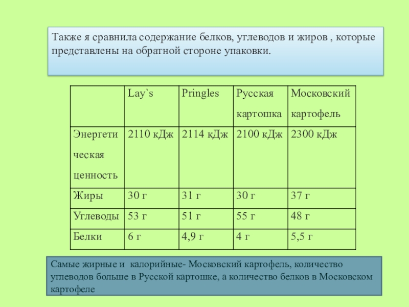 Слайд 16Также я сравнила содержание белков, углеводов и жиров , которые представлены