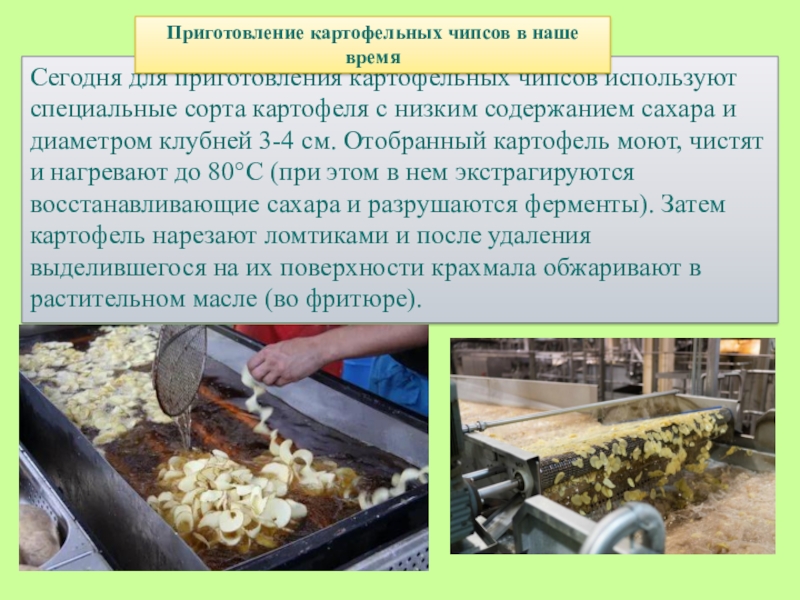Слайд 8Сегодня для приготовления картофельных чипсов используют специальные сорта картофеля с низким