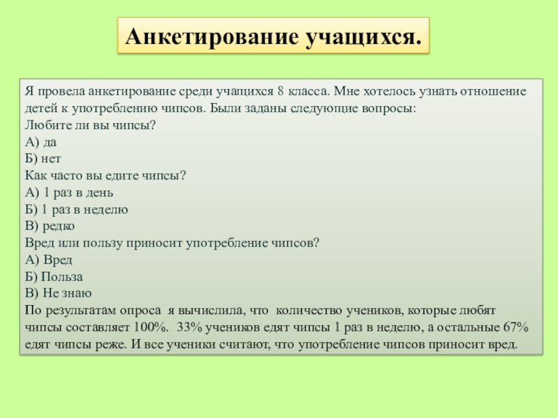 По результатам опроса я вычислила, что количество учеников, которые любят чипсы составляет 100%. 33% учеников едят чипсы 1 раз в неделю, а остальные 67% едят чипсы реже. И все ученики считают, что употребление чипсов приносит вред.