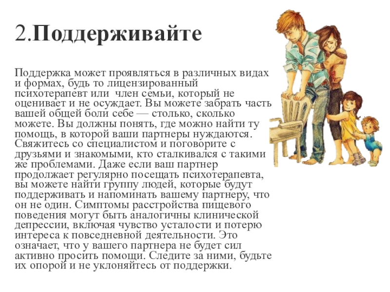 психотерапевт или член семьи, который не оценивает и не осуждает. Вы можете забрать часть вашей общей боли себе — столько, сколько можете. Вы должны понять, где можно найти ту помощь, в которой ваши партнеры нуждаются. Свяжитесь со специалистом и поговорите с друзьями и знакомыми, кто сталкивался с такими же проблемами. Даже если ваш партнер продолжает регулярно посещать психотерапевта, вы можете найти группу людей, которые будут поддерживать и напоминать вашему партнеру, что он не один. Симптомы расстройства пищевого поведения могут быть аналогичны клинической депрессии, включая чувство усталости и потерю интереса к повседневной деятельности. Это означает, что у вашего партнера не будет сил активно просить помощи. Следите за ними, будьте их опорой и не уклоняйтесь от поддержки.