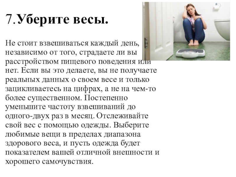 вы расстройством пищевого поведения или нет. Если вы это делаете, вы не получаете реальных данных о своем весе и только зацикливаетесь на цифрах, а не на чем-то более существенном. Постепенно уменьшите частоту взвешиваний до одного-двух раз в месяц. Отслеживайте свой вес с помощью одежды. Выберите любимые вещи в пределах диапазона здорового веса, и пусть одежда будет показателем вашей отличной внешности и хорошего самочувствия.
