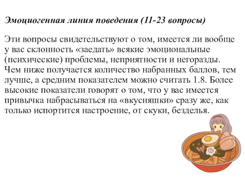«заедать» всякие эмоциональные (психические) проблемы, неприятности и негоразды. Чем ниже получается количество набранных баллов, тем лучше, а средним показателем можно считать 1.8. Более высокие показатели говорят о том, что у вас имеется привычка набрасываться на «вкусняшки» сразу же, как только испортится настроение, от скуки, безделья.