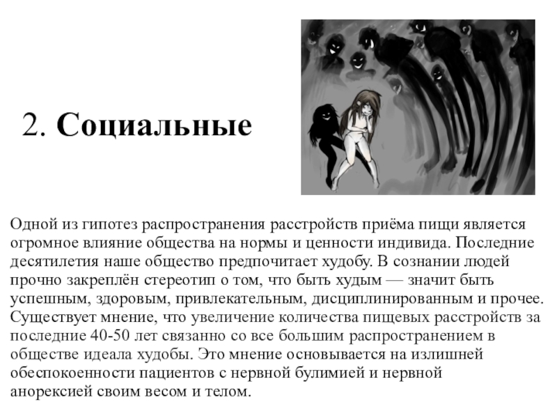 общества на нормы и ценности индивида. Последние десятилетия наше общество предпочитает худобу. В сознании людей прочно закреплён стереотип о том, что быть худым — значит быть успешным, здоровым, привлекательным, дисциплинированным и прочее. Существует мнение, что увеличение количества пищевых расстройств за последние 40-50 лет связанно со все большим распространением в обществе идеала худобы. Это мнение основывается на излишней обеспокоенности пациентов с нервной булимией и нервной анорексией своим весом и телом.