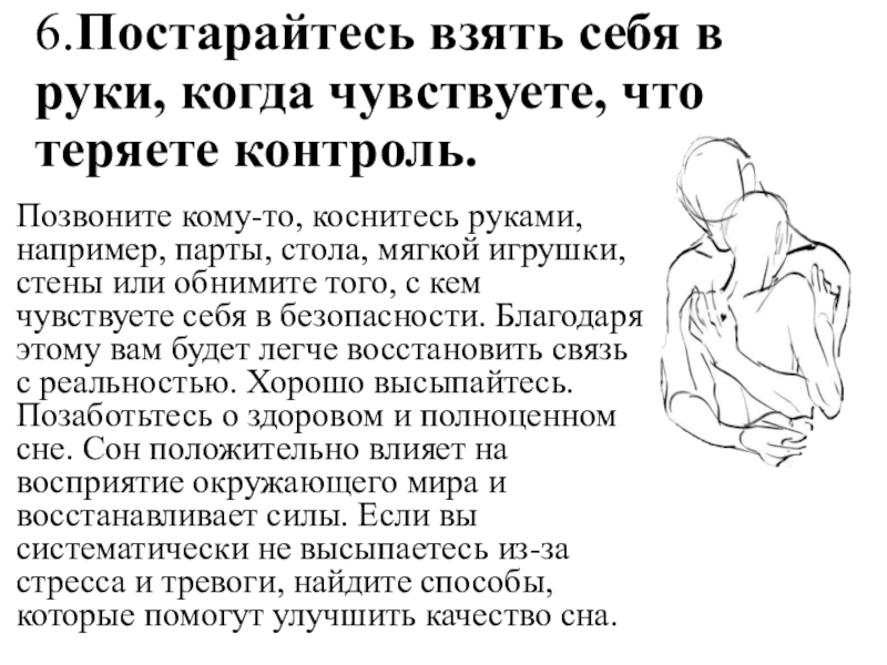 коснитесь руками, например, парты, стола, мягкой игрушки, стены или обнимите того, с кем чувствуете себя в безопасности. Благодаря этому вам будет легче восстановить связь с реальностью. Хорошо высыпайтесь. Позаботьтесь о здоровом и полноценном сне. Сон положительно влияет на восприятие окружающего мира и восстанавливает силы. Если вы систематически не высыпаетесь из-за стресса и тревоги, найдите способы, которые помогут улучшить качество сна.