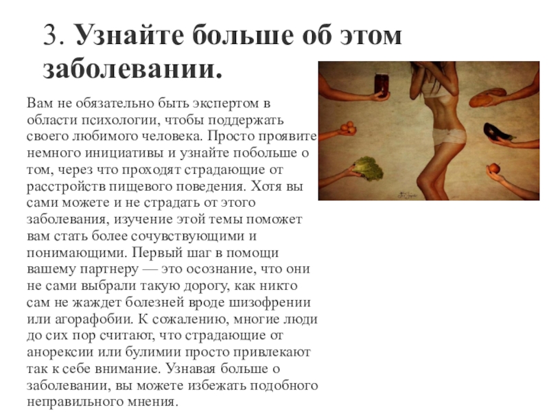 области психологии, чтобы поддержать своего любимого человека. Просто проявите немного инициативы и узнайте побольше о том, через что проходят страдающие от расстройств пищевого поведения. Хотя вы сами можете и не страдать от этого заболевания, изучение этой темы поможет вам стать более сочувствующими и понимающими. Первый шаг в помощи вашему партнеру — это осознание, что они не сами выбрали такую дорогу, как никто сам не жаждет болезней вроде шизофрении или агорафобии. К сожалению, многие люди до сих пор считают, что страдающие от анорексии или булимии просто привлекают так к себе внимание. Узнавая больше о заболевании, вы можете избежать подобного неправильного мнения.