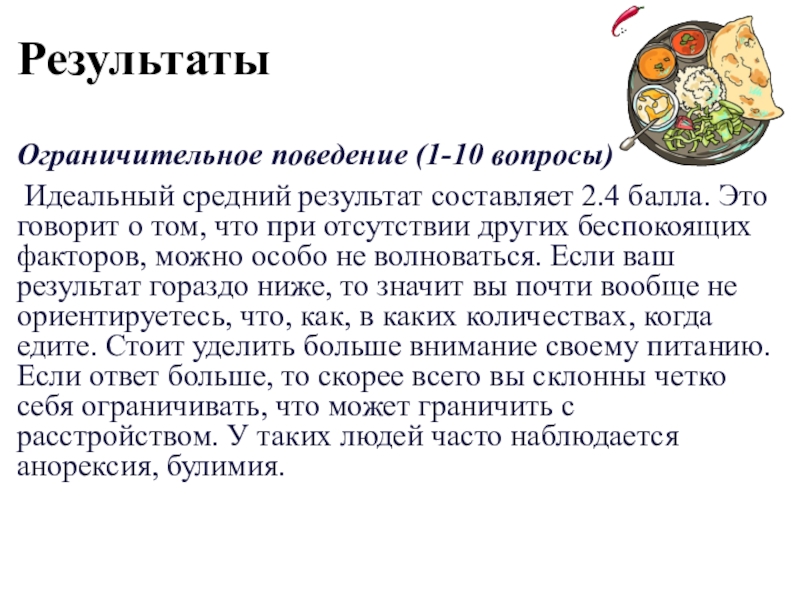 говорит о том, что при отсутствии других беспокоящих факторов, можно особо не волноваться. Если ваш результат гораздо ниже, то значит вы почти вообще не ориентируетесь, что, как, в каких количествах, когда едите. Стоит уделить больше внимание своему питанию. Если ответ больше, то скорее всего вы склонны четко себя ограничивать, что может граничить с расстройством. У таких людей часто наблюдается анорексия, булимия.