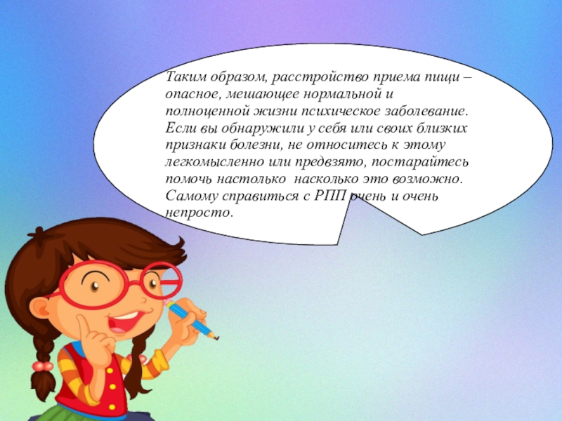 Слайд 34Таким образом, расстройство приема пищи – опасное, мешающее нормальной и полноценной