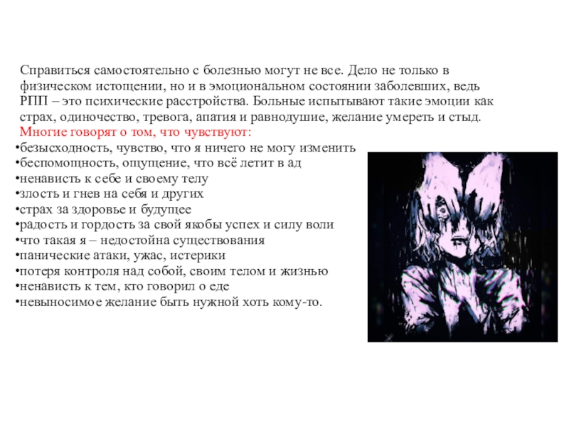 физическом истощении, но и в эмоциональном состоянии заболевших, ведь РПП – это психические расстройства. Больные испытывают такие эмоции как страх, одиночество, тревога, апатия и равнодушие, желание умереть и стыд. Многие говорят о том, что чувствуют: