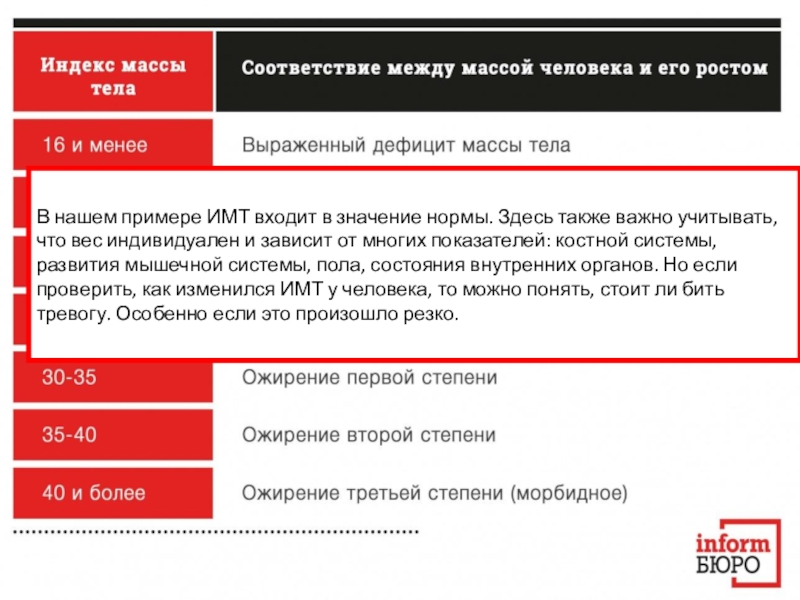 В нашем примере ИМТ входит в значение нормы. Здесь также важно