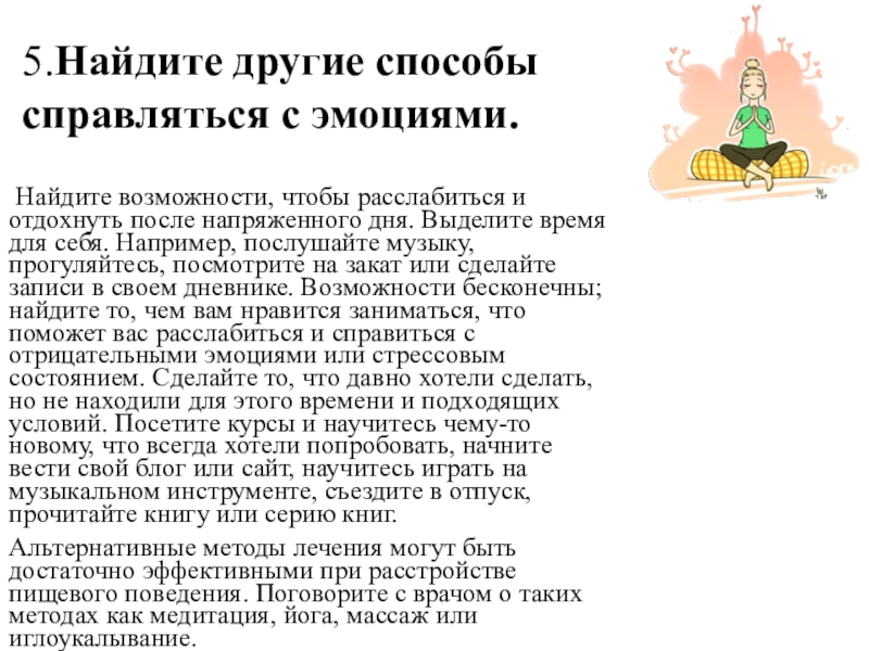 Альтернативные методы лечения могут быть достаточно эффективными при расстройстве пищевого поведения. Поговорите с врачом о таких методах как медитация, йога, массаж или иглоукалывание.