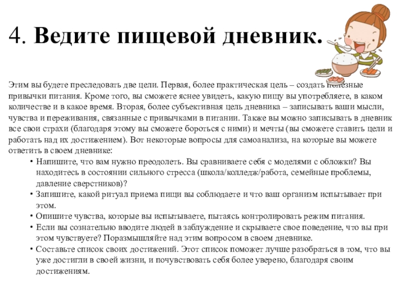 практическая цель – создать полезные привычки питания. Кроме того, вы сможете яснее увидеть, какую пищу вы употребляете, в каком количестве и в какое время. Вторая, более субъективная цель дневника – записывать ваши мысли, чувства и переживания, связанные с привычками в питании. Также вы можно записывать в дневник все свои страхи (благодаря этому вы сможете бороться с ними) и мечты (вы сможете ставить цели и работать над их достижением). Вот некоторые вопросы для самоанализа, на которые вы можете ответить в своем дневнике: