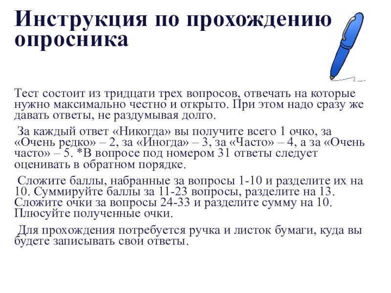 Слайд 21Инструкция по прохождению опросника