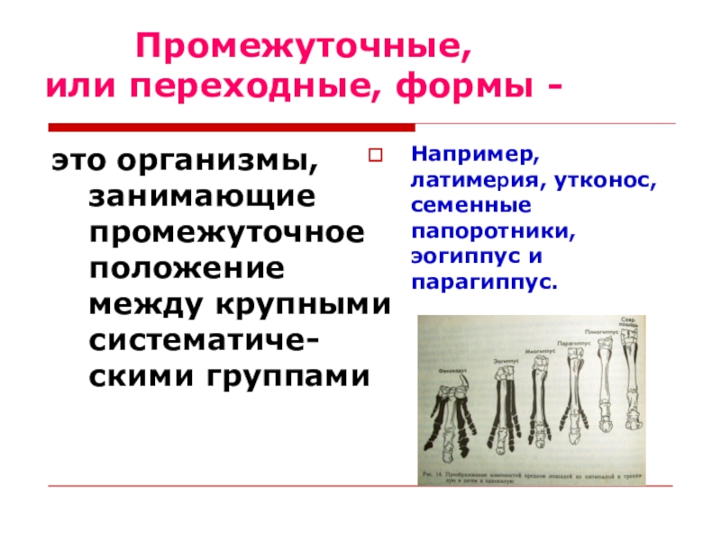 Например, латимерия, утконос, семенные папоротники, эогиппус и парагиппус.