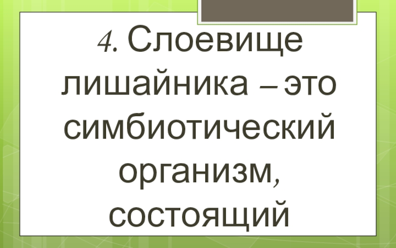 4. Слоевище лишайника – это симбиотический организм, состоящийиз гифов гриба и водоросли.