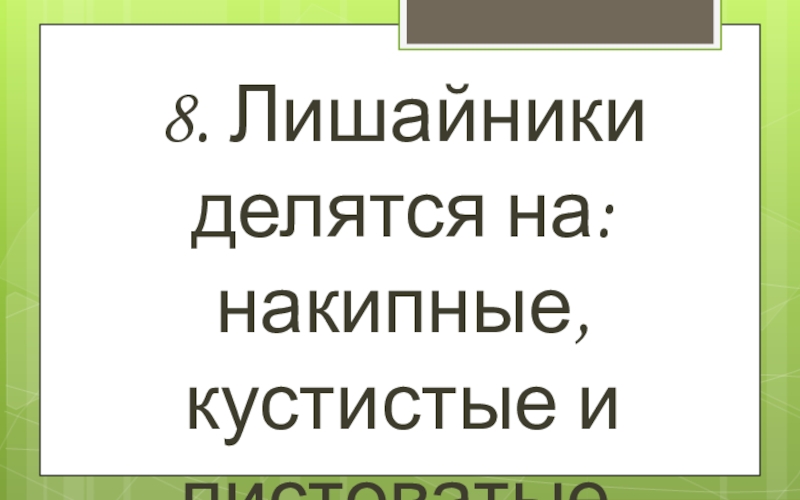 8. Лишайники делятся на: накипные, кустистые и листоватые.