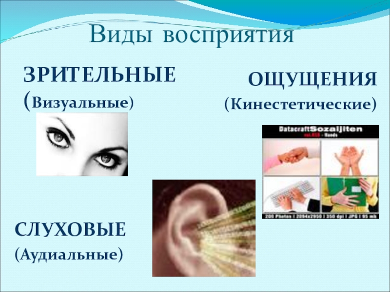 Виды восприятияЗРИТЕЛЬНЫЕ(Визуальные)СЛУХОВЫЕ(Аудиальные)ОЩУЩЕНИЯ(Кинестетические)