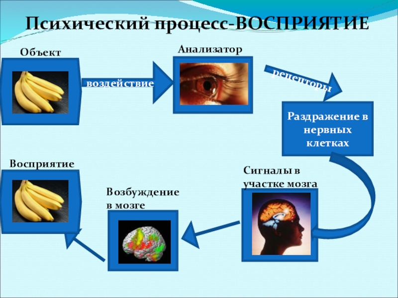 Раздражение в нервных клеткахвоздействиерецепторыОбъектАнализаторСигналы в участке мозгаВозбуждение в мозгеВосприятиеПсихический процесс-ВОСПРИЯТИЕ