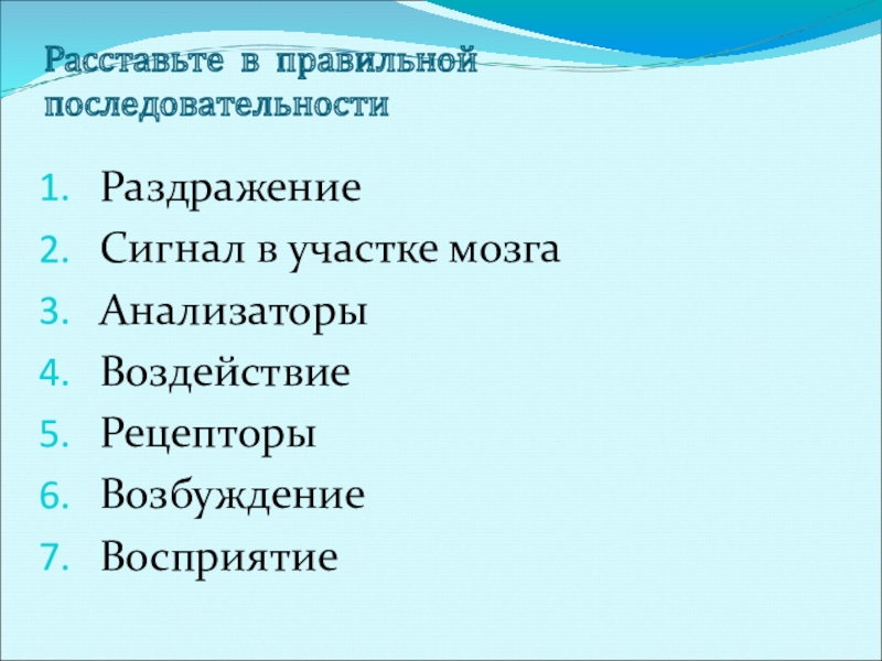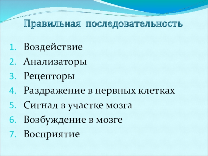 Правильная последовательностьВоздействиеАнализаторыРецепторыРаздражение в нервных клеткахСигнал в участке мозгаВозбуждение в мозгеВосприятие