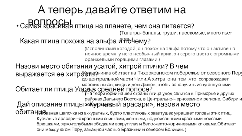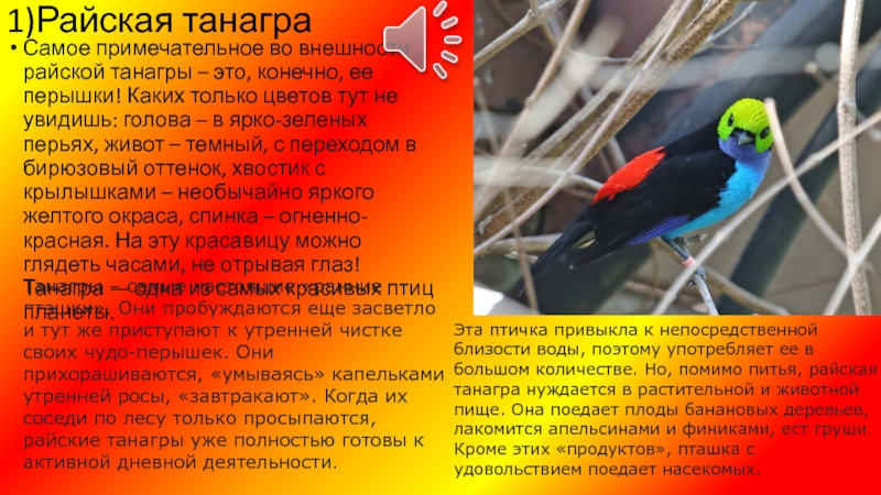 (Танагра- бананы, груши, насекомые, много пьет воды)