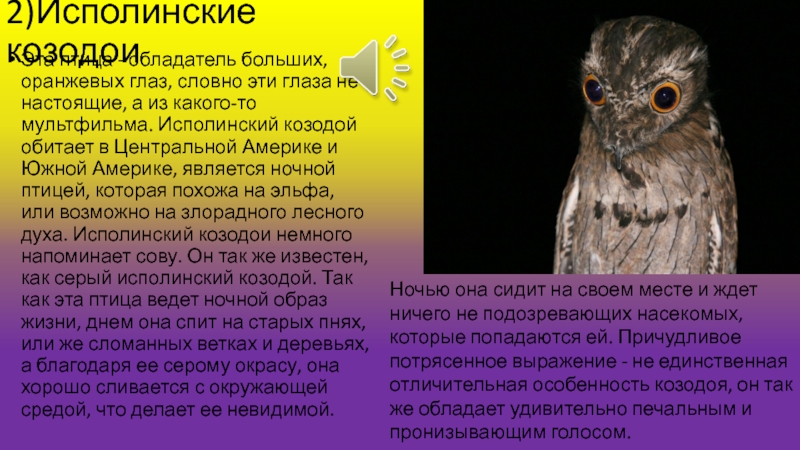 (Исполинский козодой ,он похож на эльфа потому что он активен в ночное время ,у него необычный крик ,он серого цвета с огромными оранжевыми горящими глазами.)