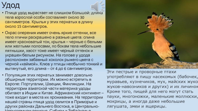 (На территории нашей страны птица удод селится в Приморье и других районах Дальнего Востока, в Центрально-Черноземном регионе, Сибири и Забайкалье.)