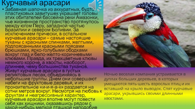 (Забавная шапочка из аккуратных, будто пластиковых завитушек украшает головы этих птиц.Курчавые арасари –с красными спинками, желтыми, подпоясанными красными поясами брюшками, ярко-голубыми ободками вокруг глаз и бело-желто-коричневыми клювами.Обитают они между югом Перу, западной частью Бразилии и севером Боливии. )
