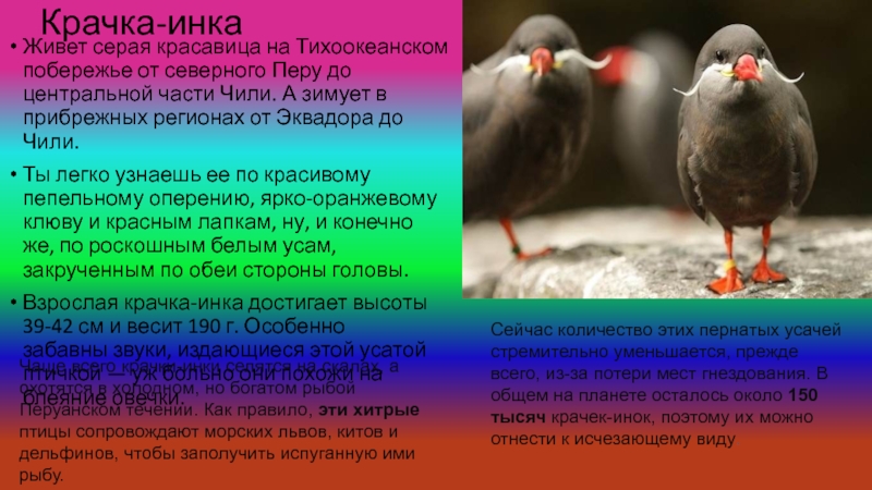 (Крачка-инка обитает на Тихоокеанском побережье от северного Перу до центральной части Чили.А хитра она тем ,что сопровождает морских львов, китов и дельфинов, чтобы заполучить испуганную ими рыбу.)