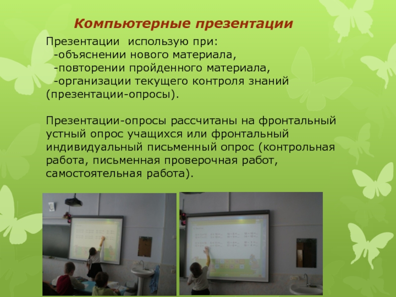 Компьютерные презентации  Презентации использую при:   -объяснении нового материала,  -повторении пройденного материала, -организации текущего