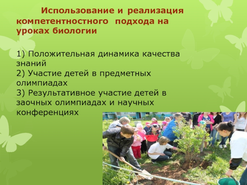 Использование и 	реализация компетентностного 	подхода на уроках биологии   1) Положительная динамика качества знаний 2) Участие