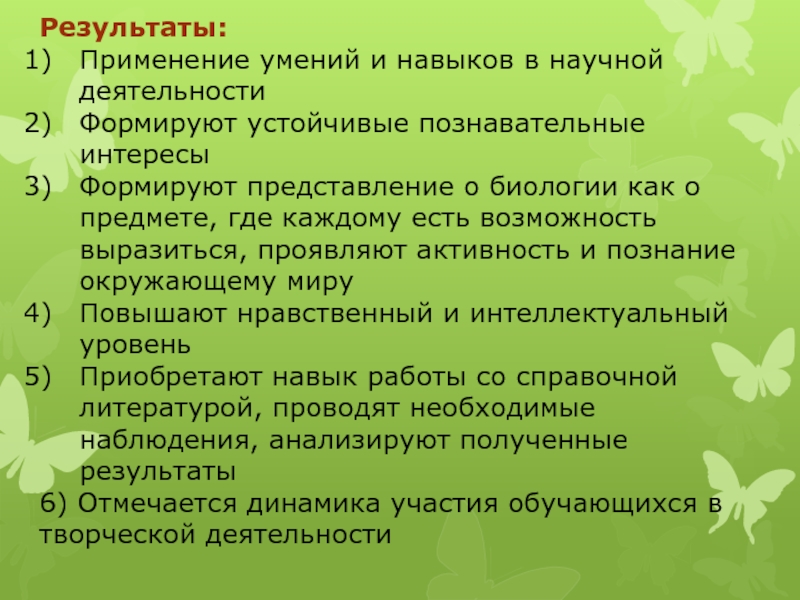 Результаты:Применение умений и навыков в научной деятельностиФормируют устойчивые познавательные интересыФормируют представление о биологии как о предмете, где