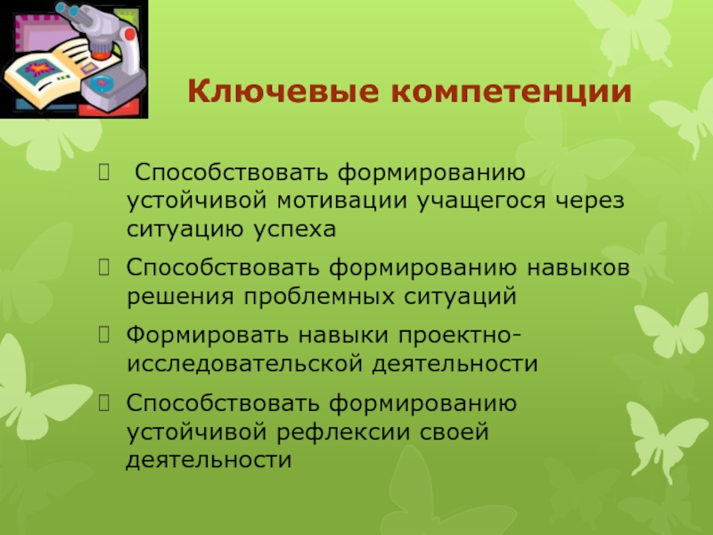 Ключевые компетенции Способствовать формированию устойчивой мотивации учащегося через ситуацию успеха Способствовать формированию навыков решения проблемных ситуаций Формировать