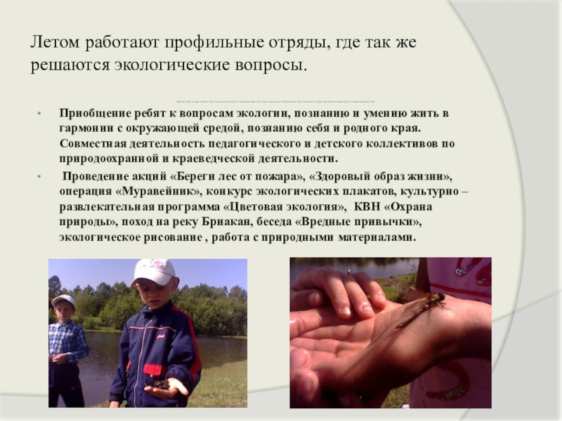 Слайд 6Летом работают профильные отряды, где так же решаются экологические вопросы.