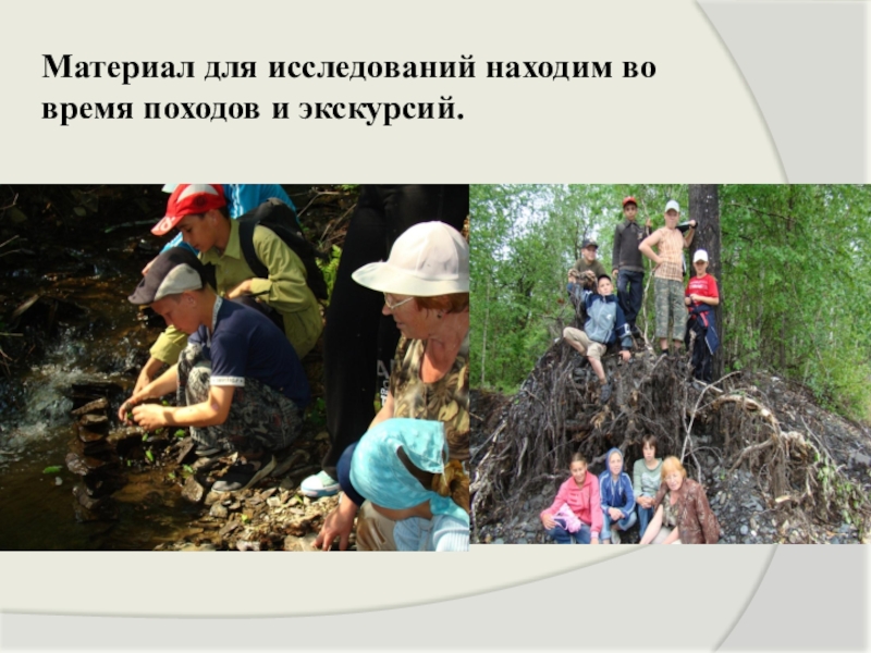 Слайд 12Материал для исследований находим во время походов и экскурсий.