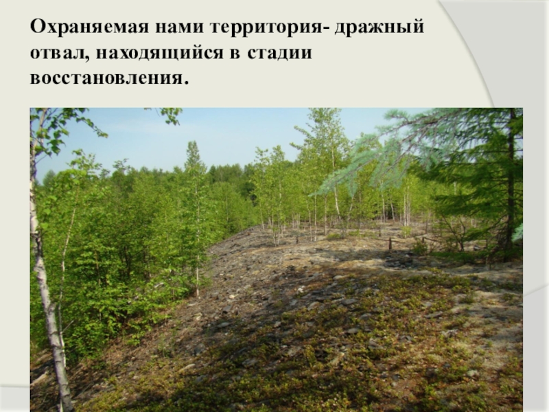 Слайд 13Охраняемая нами территория- дражный отвал, находящийся в стадии восстановления.