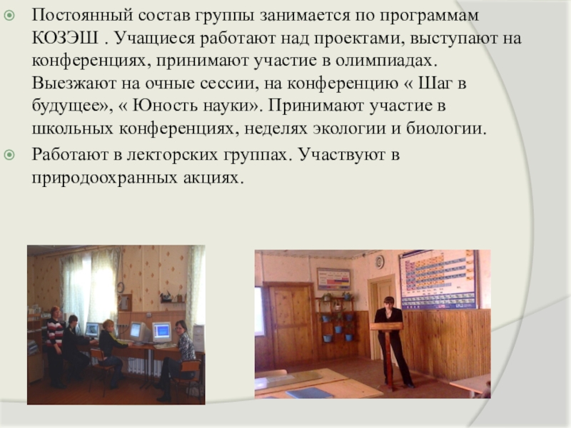 Слайд 4Постоянный состав группы занимается по программам КОЗЭШ . Учащиеся работают над