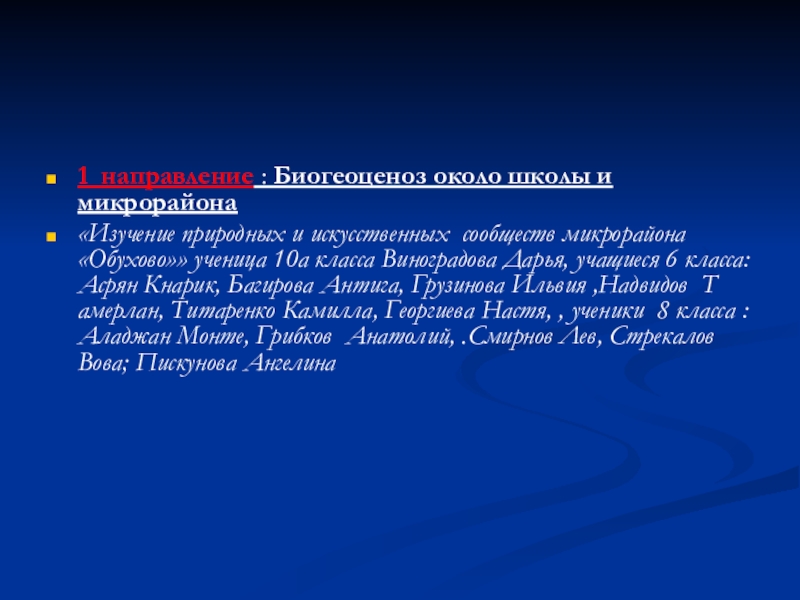 сообществ микрорайона «Обухово»» ученица 10а класса Виноградова Дарья, учащиеся 6 класса: Асрян Кнарик, Багирова Антига, Грузинова Ильвия ,Надвидов Т амерлан, Титаренко Камилла, Георгиева Настя, , ученики 8 класса : Аладжан Монте, Грибков Анатолий, .Смирнов Лев, Стрекалов Вова; Пискунова Ангелина