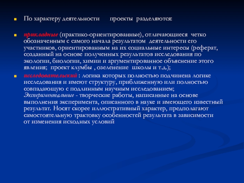 исследовательский : логика которых полностью подчинена логике исследования и имеют структуру, приближенную или полностью совпадающую с подлинным научным исследованием; Экспериментальные - творческие работы, написанные на основе выполнения эксперимента, описанного в науке и имеющего известный результат. Носят скорее иллюстративный характер, предполагают самостоятельную трактовку особенностей результата в зависимости от изменения исходных условий