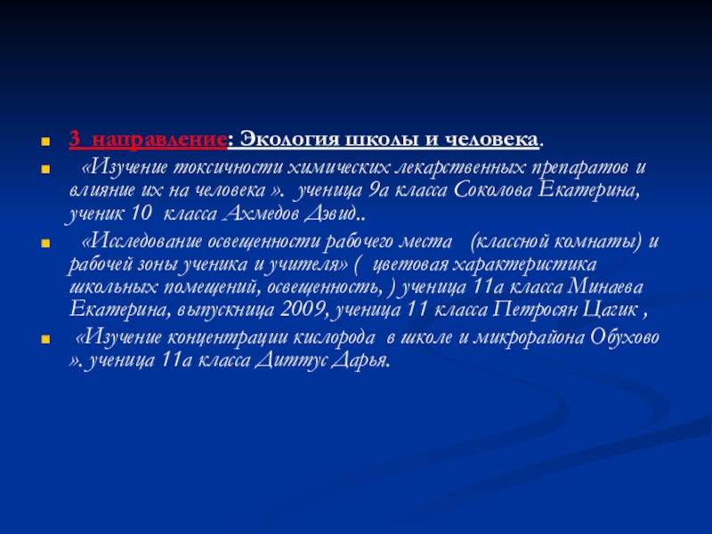 «Исследование освещенности рабочего места (классной комнаты) и рабочей зоны ученика и учителя» ( цветовая характеристика школьных помещений, освещенность, ) ученица 11а класса Минаева Екатерина, выпускница 2009, ученица 11 класса Петросян Цагик ,