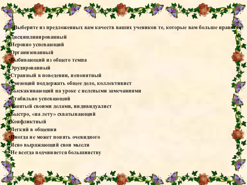 Слайд 22 Выберите из предложенных вам качеств ваших учеников те, которые вам