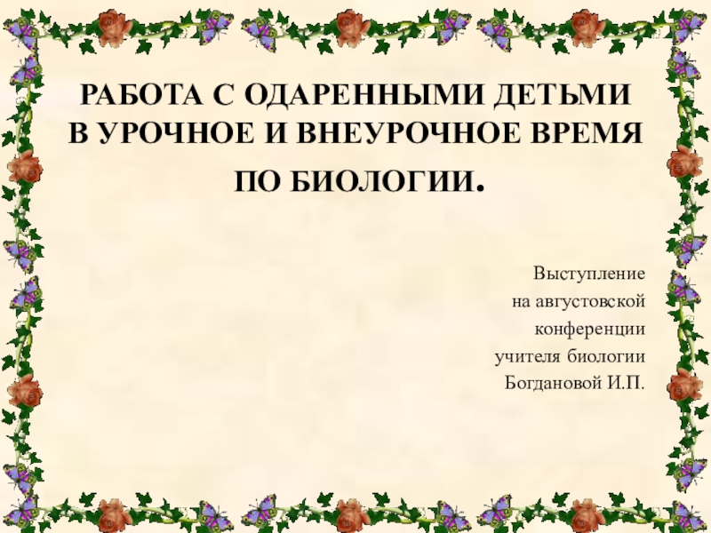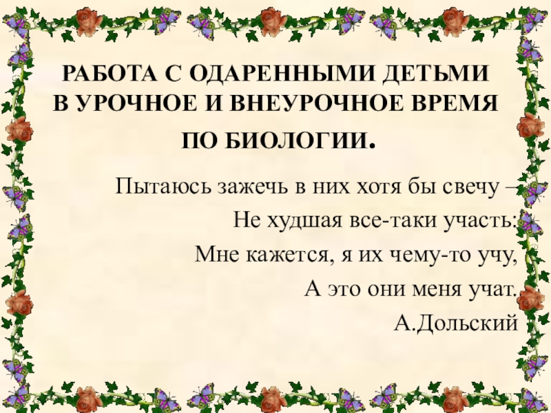 использовать индивидуальный подход в работе с одаренными школьниками на уроках биологии и во внеурочное время с учетом возрастных и индивидуальных особенностей детей;