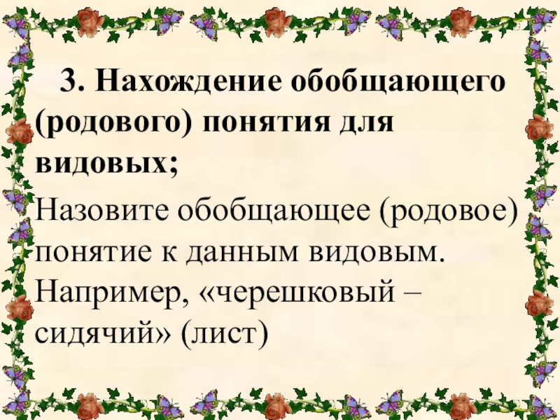 Слайд 12 3. Нахождение обобщающего (родового) понятия для видовых;