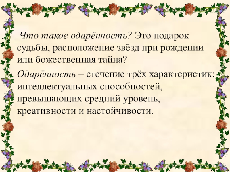 Слайд 4 Что такое одарённость? Это подарок судьбы, расположение звёзд при рождении