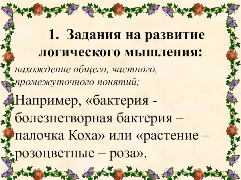 Например, «бактерия - болезнетворная бактерия – палочка Коха» или «растение – розоцветные – роза».