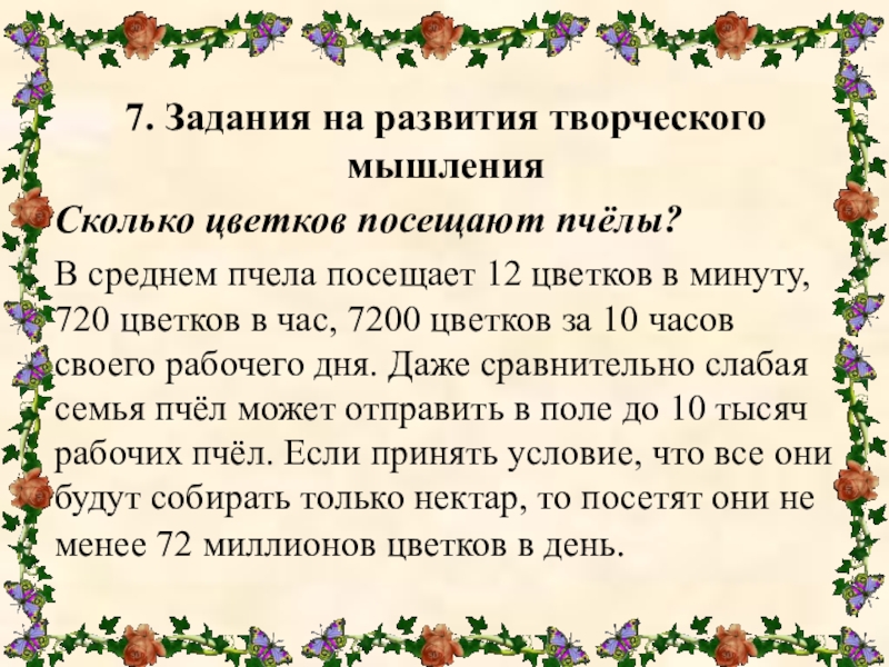 пчела посещает 12 цветков в минуту, 720 цветков в час, 7200 цветков за 10 часов своего рабочего дня. Даже сравнительно слабая семья пчёл может отправить в поле до 10 тысяч рабочих пчёл. Если принять условие, что все они будут собирать только нектар, то посетят они не менее 72 миллионов цветков в день.