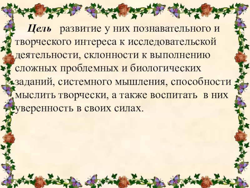 к исследовательской деятельности, склонности к выполнению сложных проблемных и биологических заданий, системного мышления, способности мыслить творчески, а также воспитать в них уверенность в своих силах.