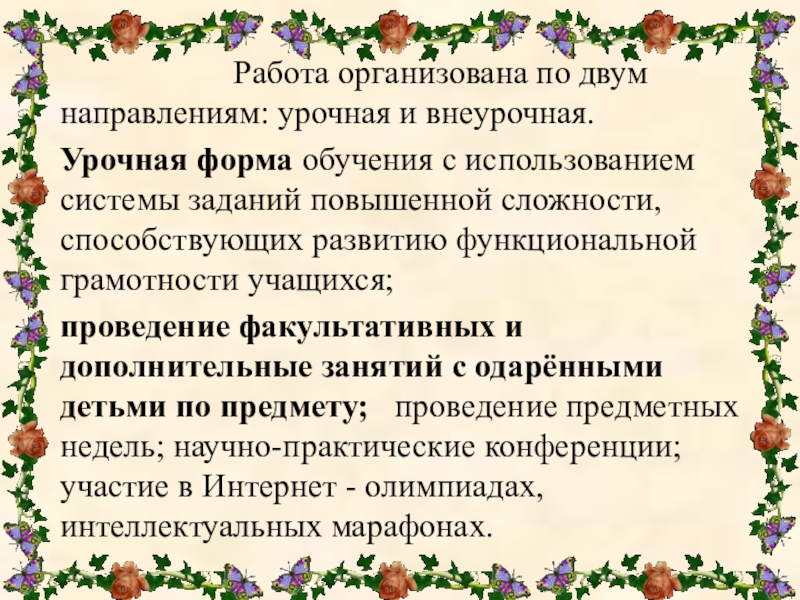 проведение факультативных и дополнительные занятий с одарёнными детьми по предмету; проведение предметных недель; научно-практические конференции; участие в Интернет - олимпиадах, интеллектуальных марафонах.